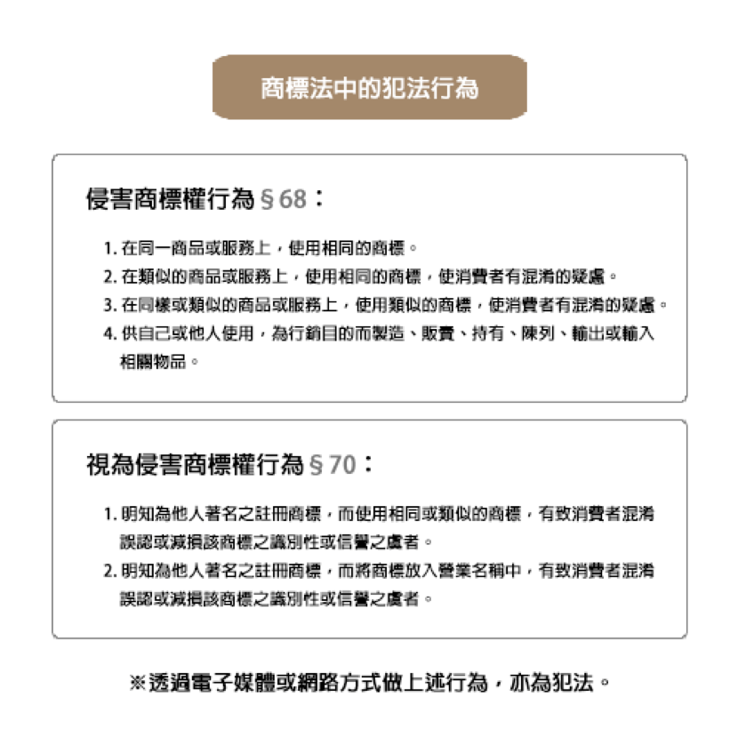 以下表格快速整理出了商標法中規定屬於侵害商標的情形,在沒有經過商標權人的同意下,做以下行為就可能構成侵害商標喔!