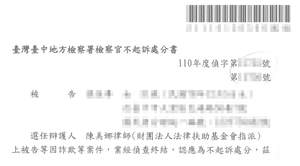 #刑事律師 #詐欺洗錢 #不起訴案例 #黃聖友律師 #陳美娜律師