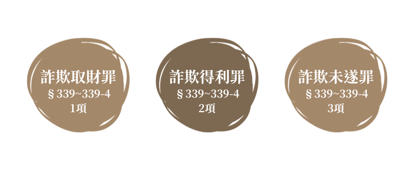 而§339條至341條規範的是詐欺的不同「手段」,而§339條至341條的第1項則是詐欺獲取財物的「詐欺取財罪」,第2項則是詐欺獲得利益的「詐欺得利罪」,以及雖然沒有成功詐欺,但仍應受罰的「詐欺未遂罪」。
