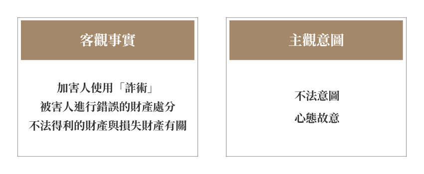 上述「詐術」是指為扭曲或虛構資訊,使人做出錯誤判斷的行為。因此,當事人被誆騙而進行了錯誤的判斷,導致財產損失,而損失的財產與加害人獲得的財產有關聯,以上為三個客觀要件。