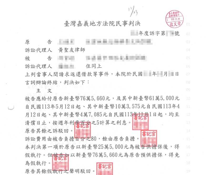 我方以LINE的對話紀錄主張消費借貸契約存在,例如:確認是否收到款項、對方表示仍須數萬元、對方聲稱需還利息、兩方約定現金交付等等,法院亦認定借款事實明確成立。 - 幫對方申請貸款之部分